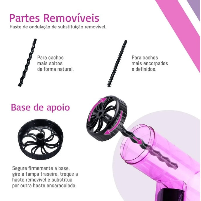Difusor de secador com modelador de cachos com hastes removíveis com a opção de escolha para cachos mais leves ou mais encorpadas. Cabelos secos e modelados em menos tempo.